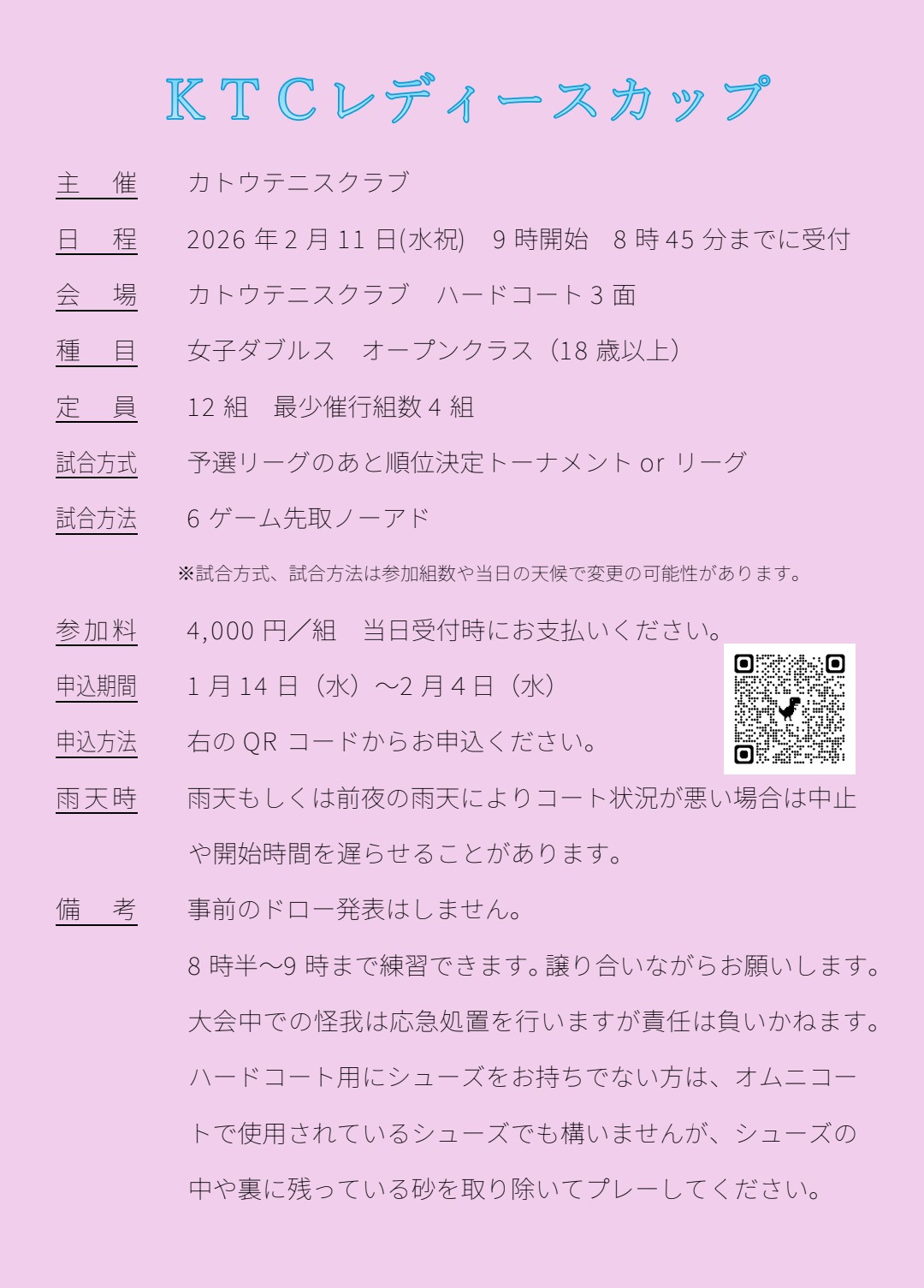 2月11日(水祝)に女子ダブルスの大会を行います。